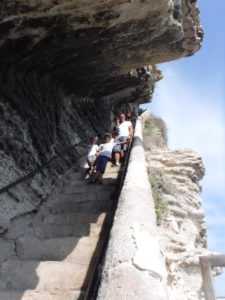 Le changement d’ambiance est violent car il y a énormément de touristes sur le port. Tous ces va et vient font tourner la tête de notre invitée qui commence à sentir la fin du voyage. On décide de manger sur le bateau pour pouvoir profiter d’une longue visite de la ville haute l’après-midi. Nous prenons le petit train (Samuel est trop content) pour monter tout en haut. Nous visitons la ville, montons les 187 marches de l’escalier du roi d’Aragon, explorons le Bastion de l’Etendard grâce à un parcours ludique destiné aux enfants et finissons notre découverte par une bonne glace et une belle promenade le long de la falaise avec une vue stupéfiante sur la côte.
