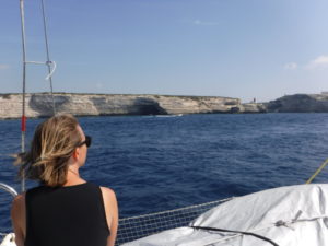 Nous prenons le départ à 10h direction Bonifacio. Le vent nous emmène à destination en 1h30. L’arrivée est magique dans ce port enclavé, caché par les falaises. Anne et moi, en bonnes anciennes étudiantes de Khâgne, nous interrogeons sur l’étonnant changement géologique entre la côte en amont de Bonifacio et celle en aval. C’est un peu comme passer des montagnes du Colorado aux falaises d’Etretat en quelques mètres.
