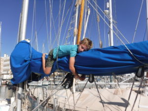 Nous réservons cette journée à de petits travaux car il y en a encore et toujours. Aujourd’hui au programme : rénovation des chandeliers abimés, réfection des filières, réparation des feux de navigation par un électricien et peinture de notre planche de quai. Cette dernière est très utile et nous permet de descendre sur le quai sans avoir à faire des figures gymniques à la Nadia Comaneci. Simon l’avait récupérée gracieusement sur un chantier lors de notre escale sur Formentera.