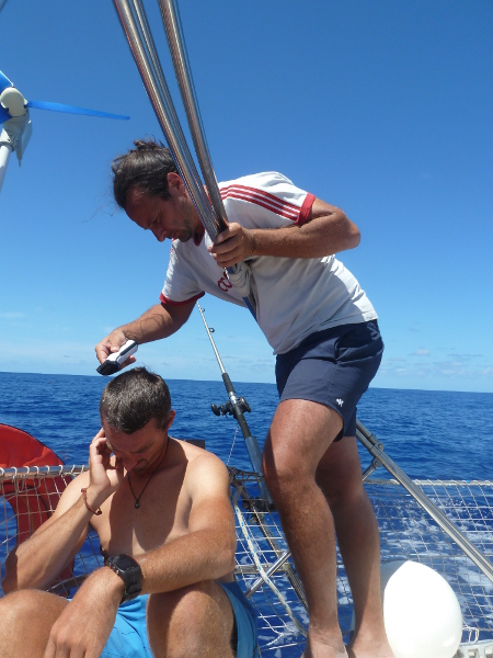 Finalement, il y a pas mal davantage à la pétole : le bateau est stable, il fait beau, on cuisine sans difficultés, on mange même sur la table du cockpit, on lit, on discute, on rigole pas mal de la situation. Les quarts se déroulent très bien, il n’y a pas de fatigue, au contraire de notre départ de Pointe à Pitre. L’équipage est beaucoup plus serein. Jef est de mieux en mieux de jour en jour, dans ses repères, ses actions. Loïc regrette de ne pas avoir emmener dans son nécessaire un casque anti-bruit car, le truc chiant, c’est le bruit du moteur et puis qu’on ne pêche rien du tout. Pire on perd les rapalas! Mathieu est toujours aussi efficace en équipier et puis il joue de la guitare.