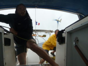 Pas d’inquiétude à terre à présent c’est plus calme, plus d’eau dans les cales et l’allure est plus agréable pour tout le monde. Simon